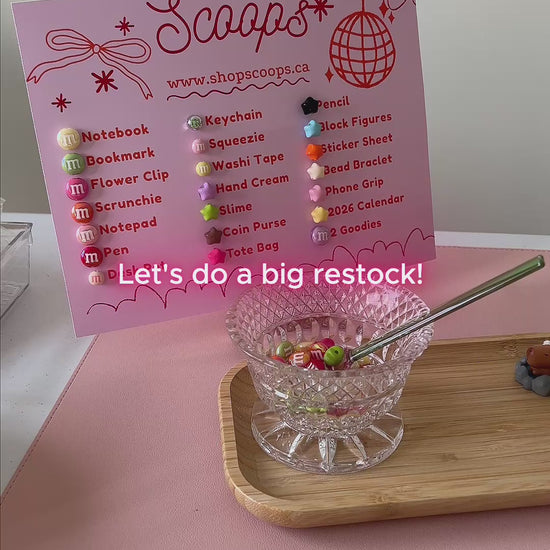 Each scoop is a lucky dip of 9-10 goodies — think notepads, pens, squishy toys, keychains, mini claw clips, washi tapes, mini notebooks, bookmarks, scrunchies, slime, bracelets, tote bags… and all the fun in between!